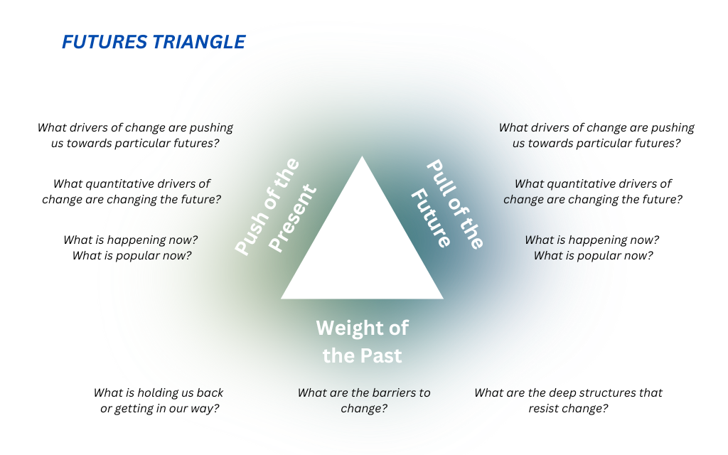 The Futures Triangle explains change: It maps the push of the present, pull of the future, and weight of the past to guide strategic decision-making.